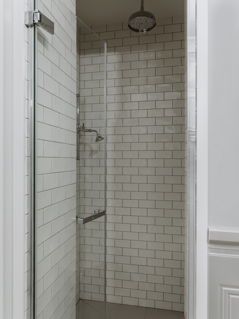 В ванной комнате сделали удобную и просторную душевую, разместили большое зеркало на стене, которое придало объем этому помещению. Изначально планировали разместить стиральную машину в ванной комнате в хозяйских шкафах, но технически помещалась только узкая стиральная машина, поэтому перенесли ее на кухню и сделали встроенную стандартную машину с сушкой на 60 см. В ванной есть технический шкаф, где спрятан накопительный бойлер, гребенка и счетчики, а еще есть место для хранения бытовой химии и средств для уборки.