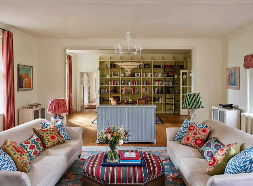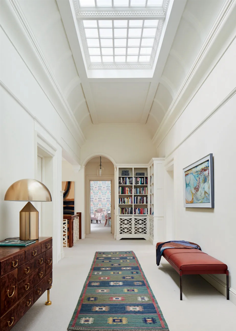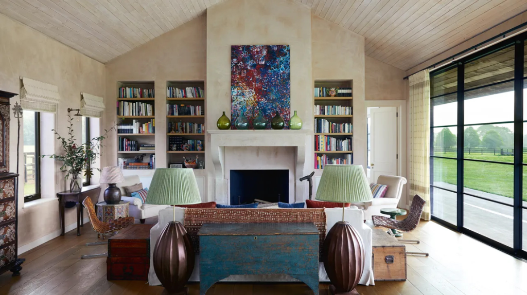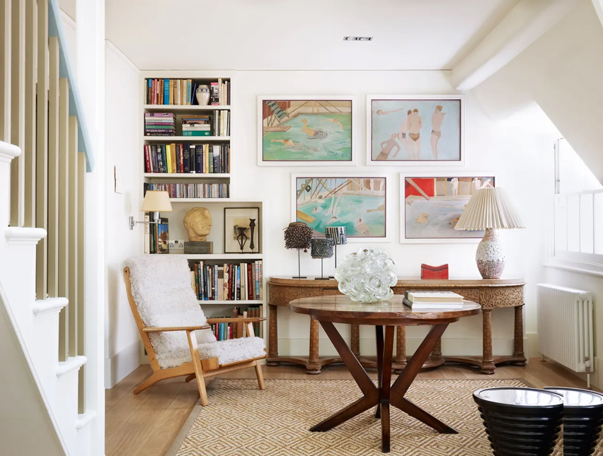Библиотека — это не только вертикаль. Малые стеллажи, расположенные вдоль подоконников, диванов или даже вокруг дверных проемов, придают дому неожиданный ритм. Книга здесь не возвышается, а живет рядом, скромно и ненавязчиво, становясь частью повседневности.