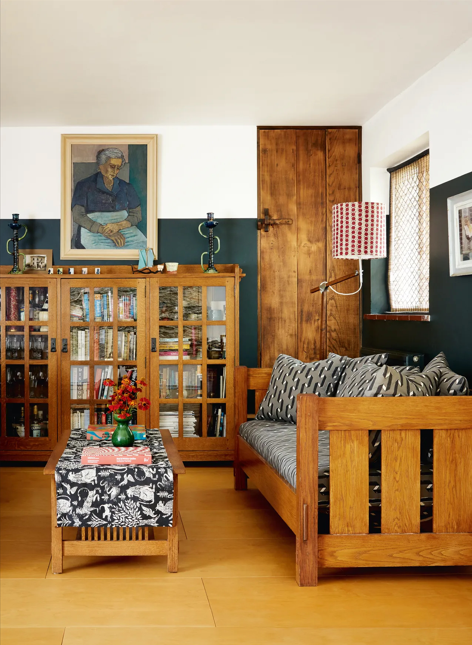 Уголок-объятие. Два смежных стеллажа, сходящиеся в углу комнаты, формируют нишу, где особенно приятно сидеть с книгой. Здесь пространство словно само оберегает читателя от суеты.