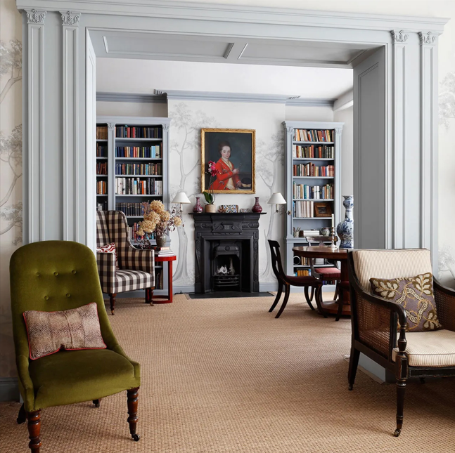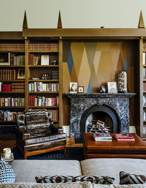 Стена-картина. Когда вся поверхность от пола до потолка превращается в книжное панно. Это монументально, эффектно и придает дому весомость — словно вы находитесь не в квартире, а в камерном зале университета.