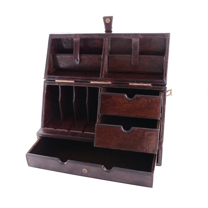 Складной органайзер с выдвижными ящичками выполнен из натуральной кожи. Станет удобным дополнением для кабинета и прекрасным подарком настоящему джентльмену.