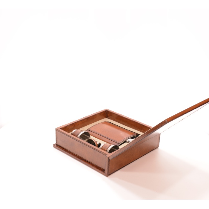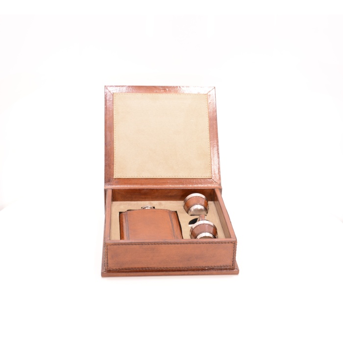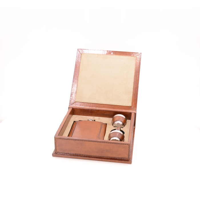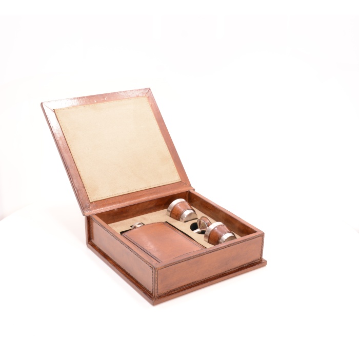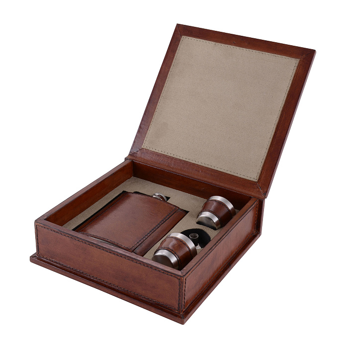 Шкатулка, фляга и стопки декорированы натуральной кожей. Станет украшением библиотеки или прекрасным подарком настоящему джентльмену.