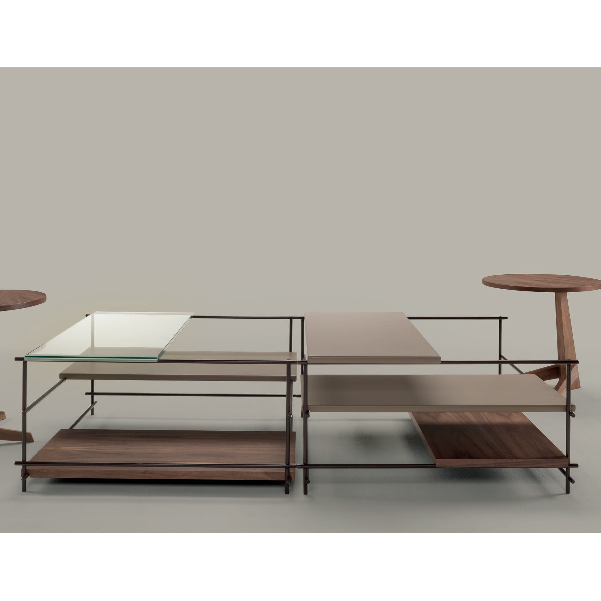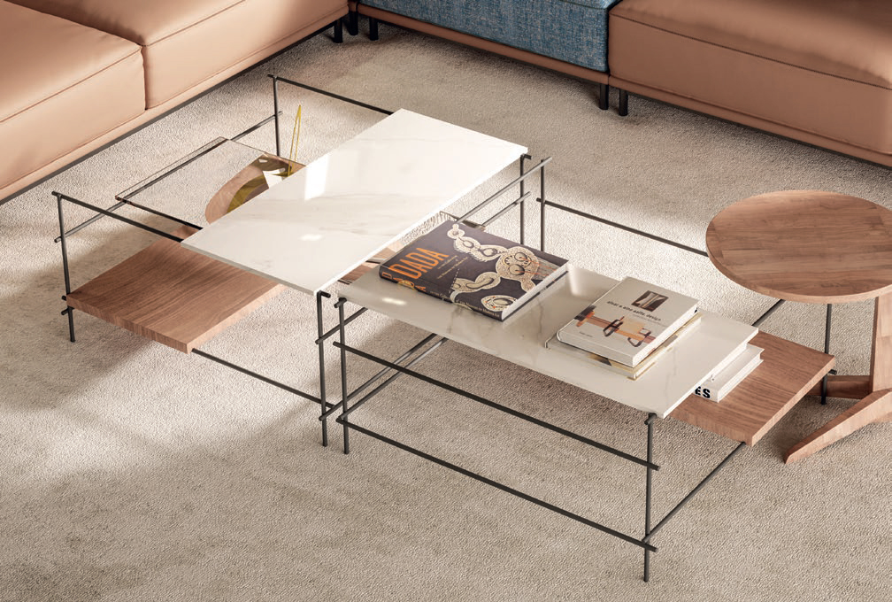 Основание столика выполнено из железа в финише черного или золотого цвета. Элементы столешницы шириной 40 см располагаются на разных уровнях, могут быть выполнены из стекла, дерева, кожи или мрамора Калакатта или Порторо.