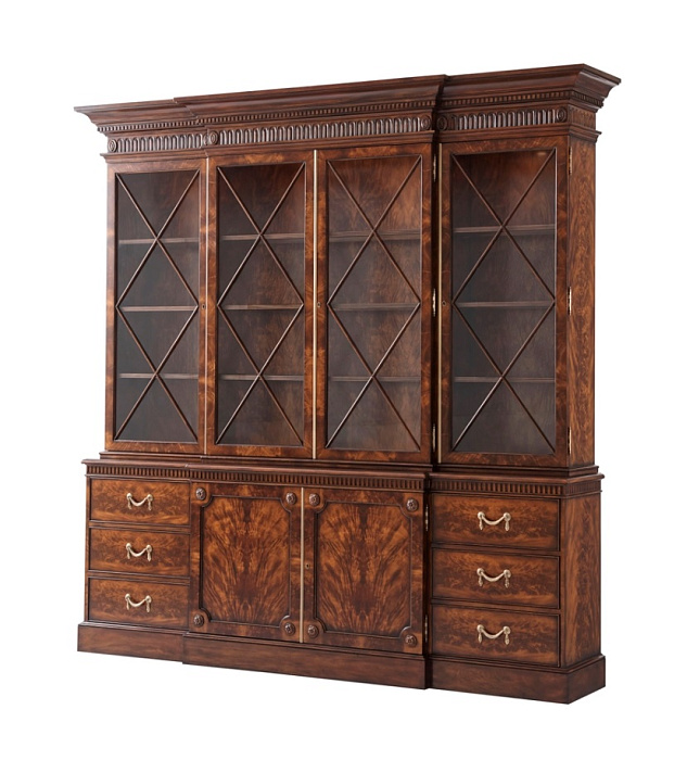 Классический книжный шкаф в стиле ампир изготовлен из красного дерева, декорирован шпоном пламенный махагон и латунной фурнитурой. Верхняя секция с резным карнизом над четырьмя распашными дверцами с ромбовидными деревянными накладками оснащена подсветкой. В нижней секции 6 выдвижных ящиков и две распашные филенчатые дверки, украшенные нарядной выкладкой шпона в виде языков пламени и резными акантовыми розетками но углам.