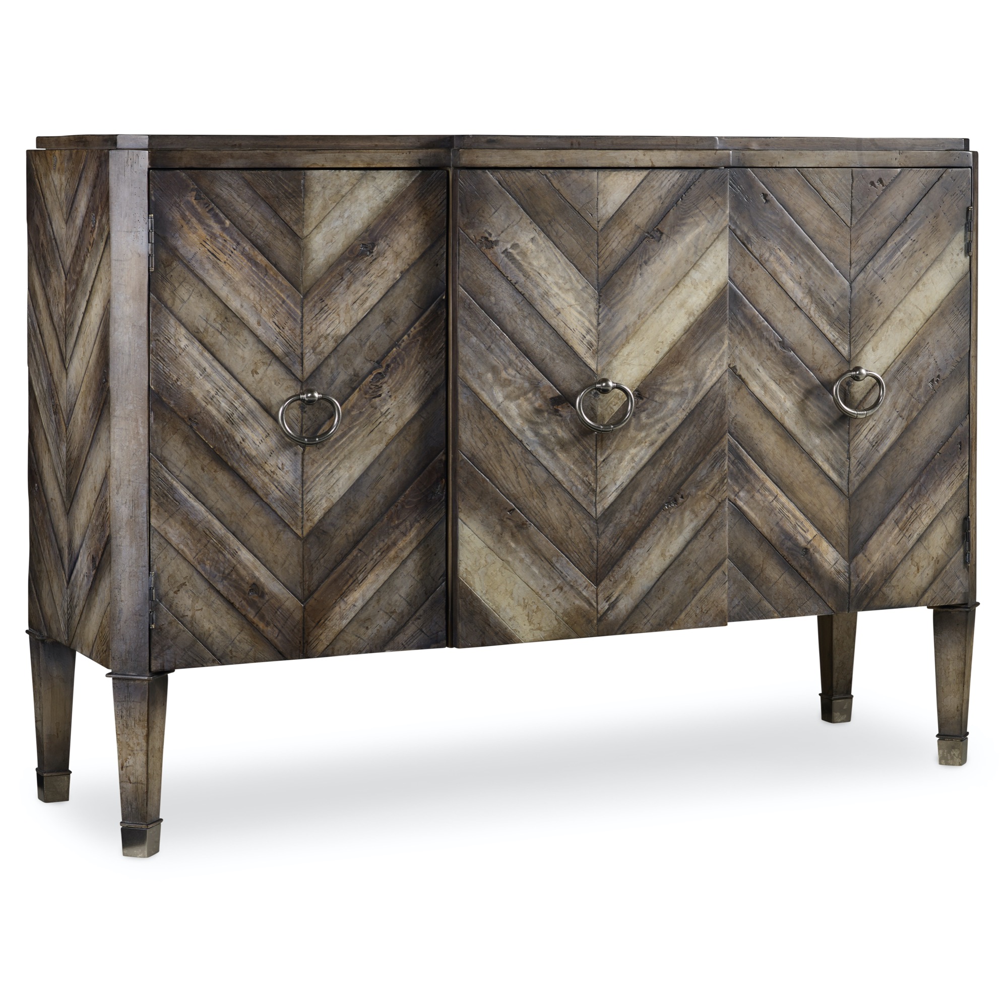 Консоль "Шеврон" состоит из трех дверей с регулируемой полкой за каждой дверью. Березовый, сосновый и дубовый шпон объединились в одном предмете, создав интересный шевронный узор.