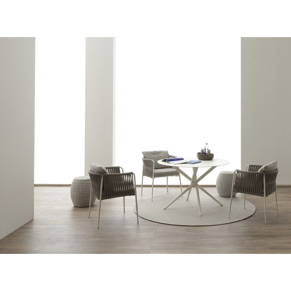 Argentario — это минималистичный обеденный стол, который становится главным героем элегантной и светлой обстановки на открытом воздухе. Его размер делает его идеальным для небольших открытых площадок.