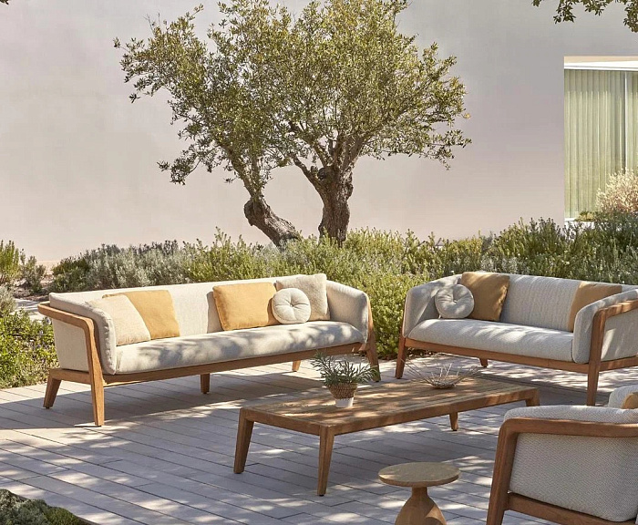 Основание дивана выполнено из массива тропического ироко (африканский тик) и покрыто натуральным тиковым маслом в соответствии с европейскими стандартами. Натуральное масло защищает изделие от грязи и ультрафиолетовых лучей. Совершенный технологический процесс сушки древесины обеспечивает ей максимальную степень влагоустойчивости. Для обивки используются ткани, предназначенные для уличной мебели, они не боятся грязи и различных влияний окружающей среды, а также устойчива к выцветанию. По желанию можно выбрать ткань производства Франции, Испании и Бельгии.