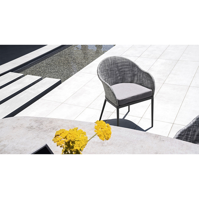 Алюминиевая конструкция. Сиденье и спинка из VAR # TEX (техническая ткань из ПВХ), эксклюзивный патент Varaschin. Подушка с наполнителем из каучука с открытыми порами Dryfeel®, подходит для использования вне помещений. Структура устойчива к атмосферным воздействиям и солнечному свету (УФ).