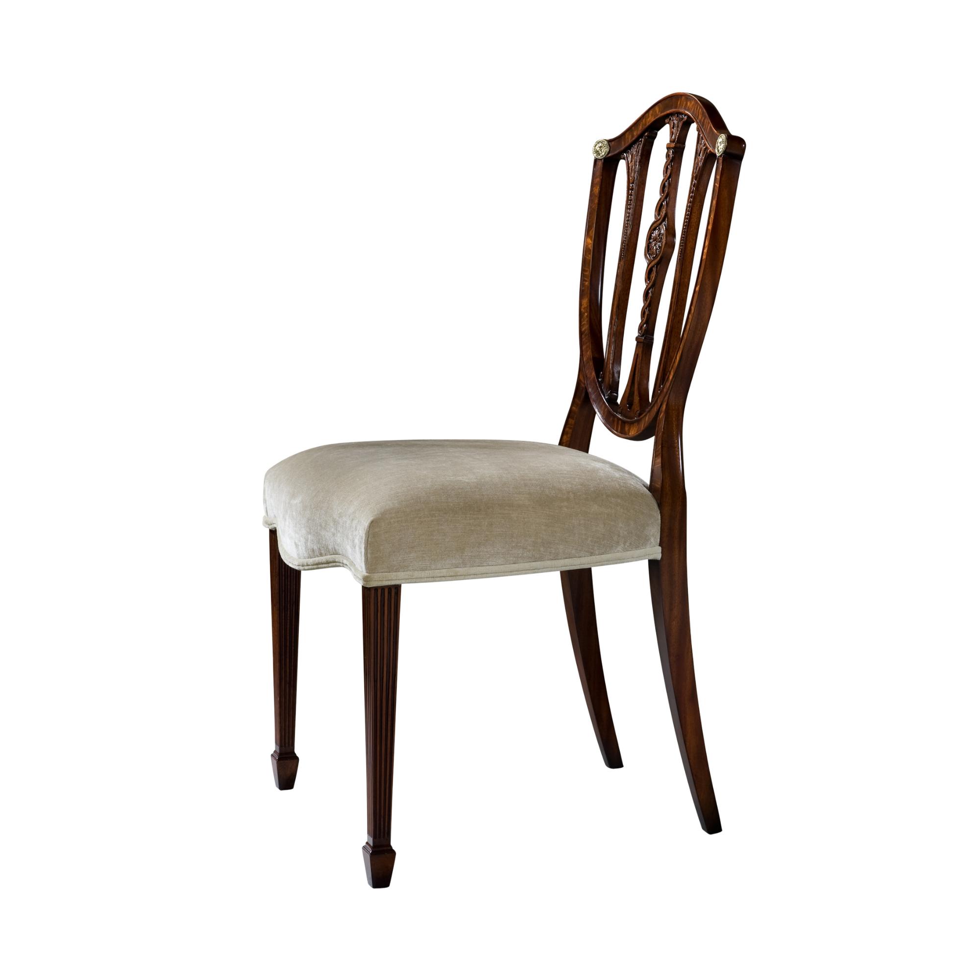 Великолепный оригинальный стул в стиле Георга III выполнен из массива красного дерева и декорирован шпоном махагона. Сиденье обито серой бархатной тканью. Резная "прозрачная" спинка придает легкость и изящество креслу. Спинка украшена круглыми бронзовыми розетками.