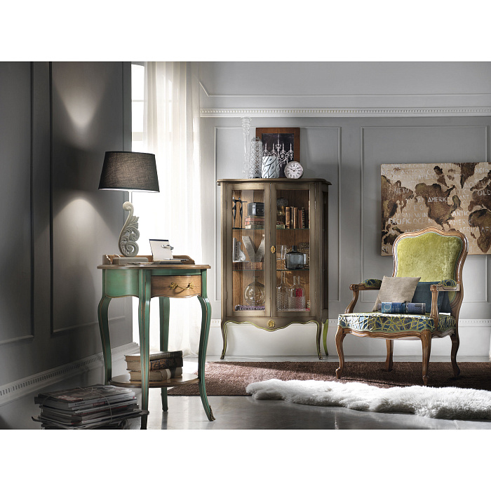 Двустворчатая витрина из коллекции Verona выполнена в классическом стиле. Она прекрасно сочетается с тумбой под телефон (арт. BV5375). Дополняет композицию кресло с высокой спинкой (арт. BV5377).
