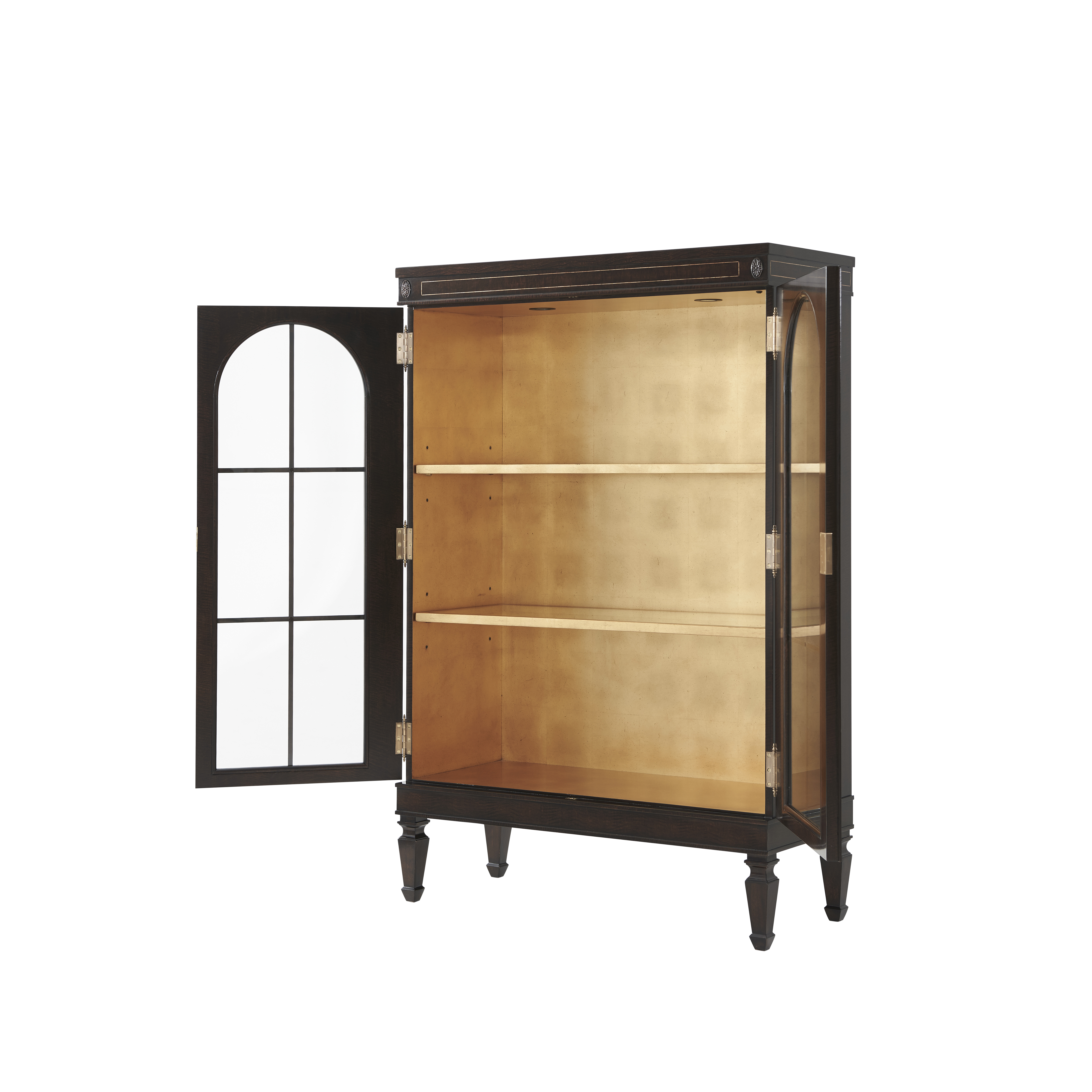 Оригинальная витрина в стиле ампир выполнена из массива красного дерева, декорирована шпоном махагона. Дверцы витрины украшены стеклянными вставками в виде арок. Внутри она выкрашена золотой краской, которая в совокупности с подсветкой создает ощущение небывалой яркости. Четыре резные ножки прочно поддерживают витрину.