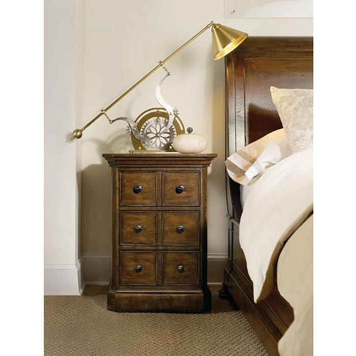 Нестандартная прикроватная тумба в виде телефонного ретро-столика выполнена из твердых сортов дерева в тонировке Soft Pecan. Для отделки используются антикварные пластины и кольцевидные ручки из бронзы с эффектом старения.