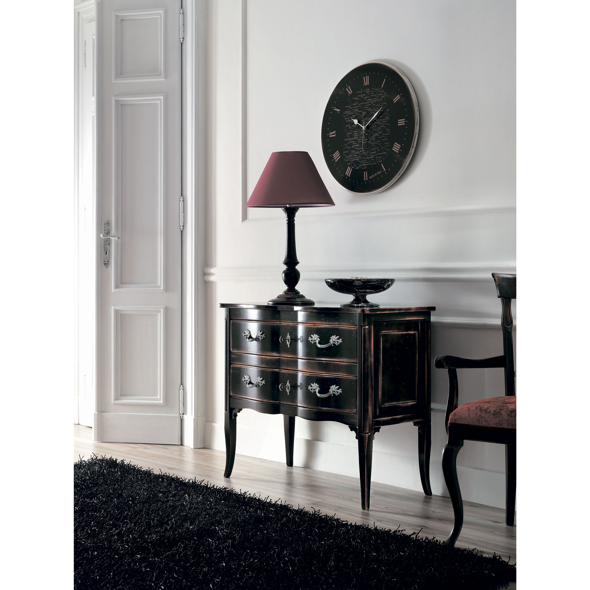 На комоде располагается небольшая лампа (арт. H120 N, высота: 68 см). Дополняют композицию часы в чёрном цвете (арт. H119, диаметр 60 см).