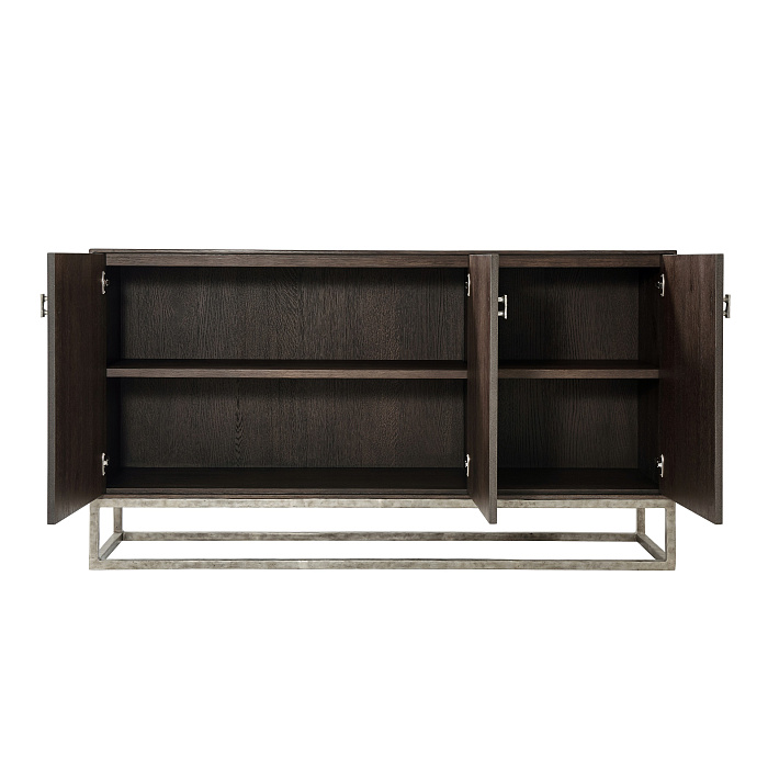 Комод "Кемп" в современном рустикальном стиле выполнен в отделке «темный дуб». Комод декорирован шпоном состаренного дуба в технике паркетри. Распашные дверцы в отделке "Крайтон" декорированы тисненой шагреневой кожей. Отлитые вручную металлические ручки, имитирующие плетение, подчеркивают рустикальный дизайн.