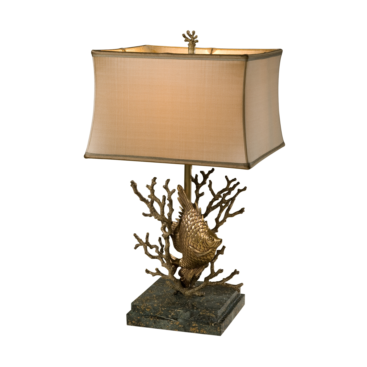 Лампа в стиле европейской эклектики. Основание выполнено из бронзы в виде морской композиции - коралла и рыбы. Подставка выполнена из зеленого мрамора. Шелковый кремового цвета абажур сшит вручную.