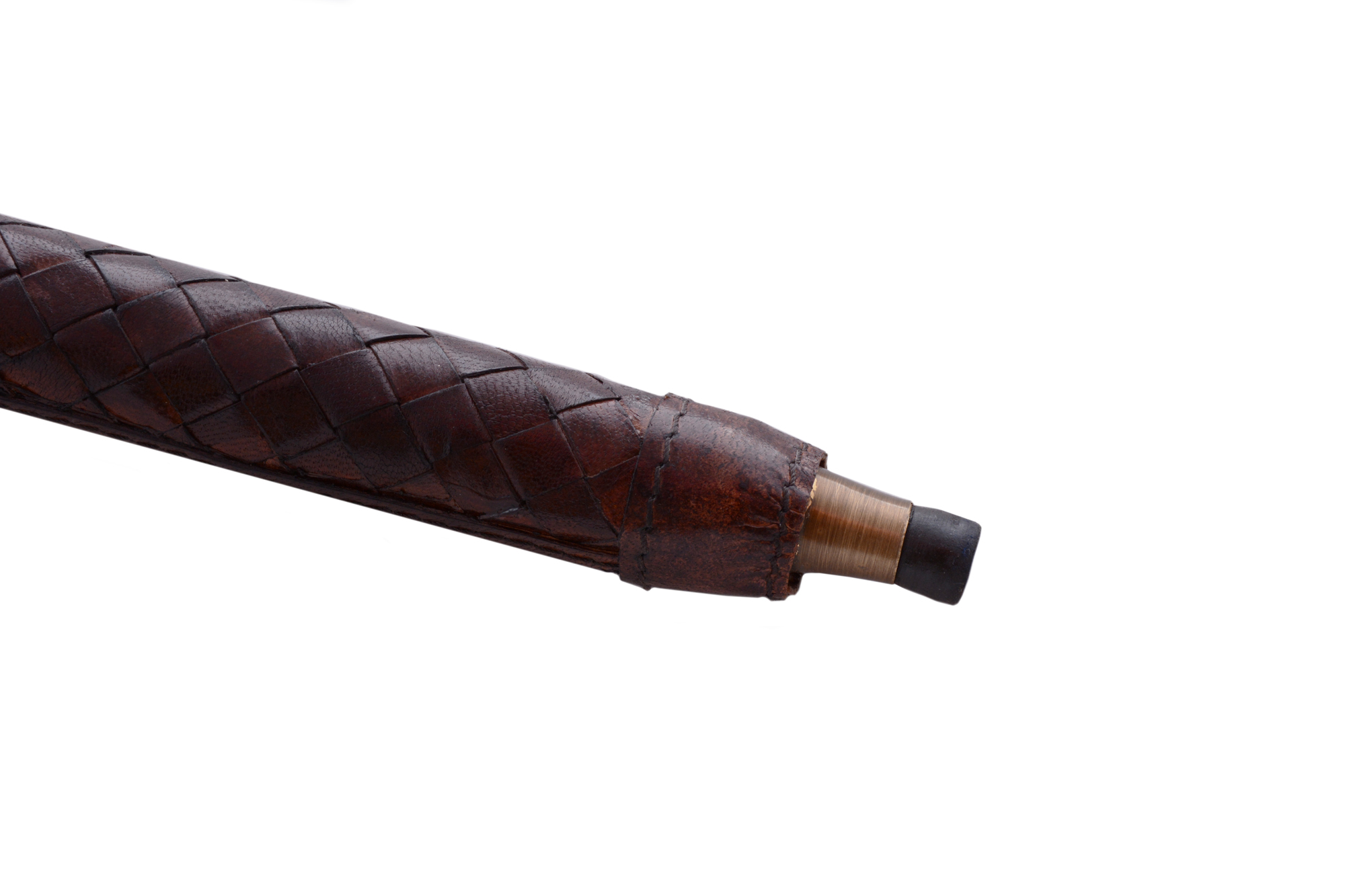 Трость выполнена из металла и декорирована натуральной кожей. Этот функциональный и стильный аксессуар станет прекрасным подарком настоящему джентльмену.