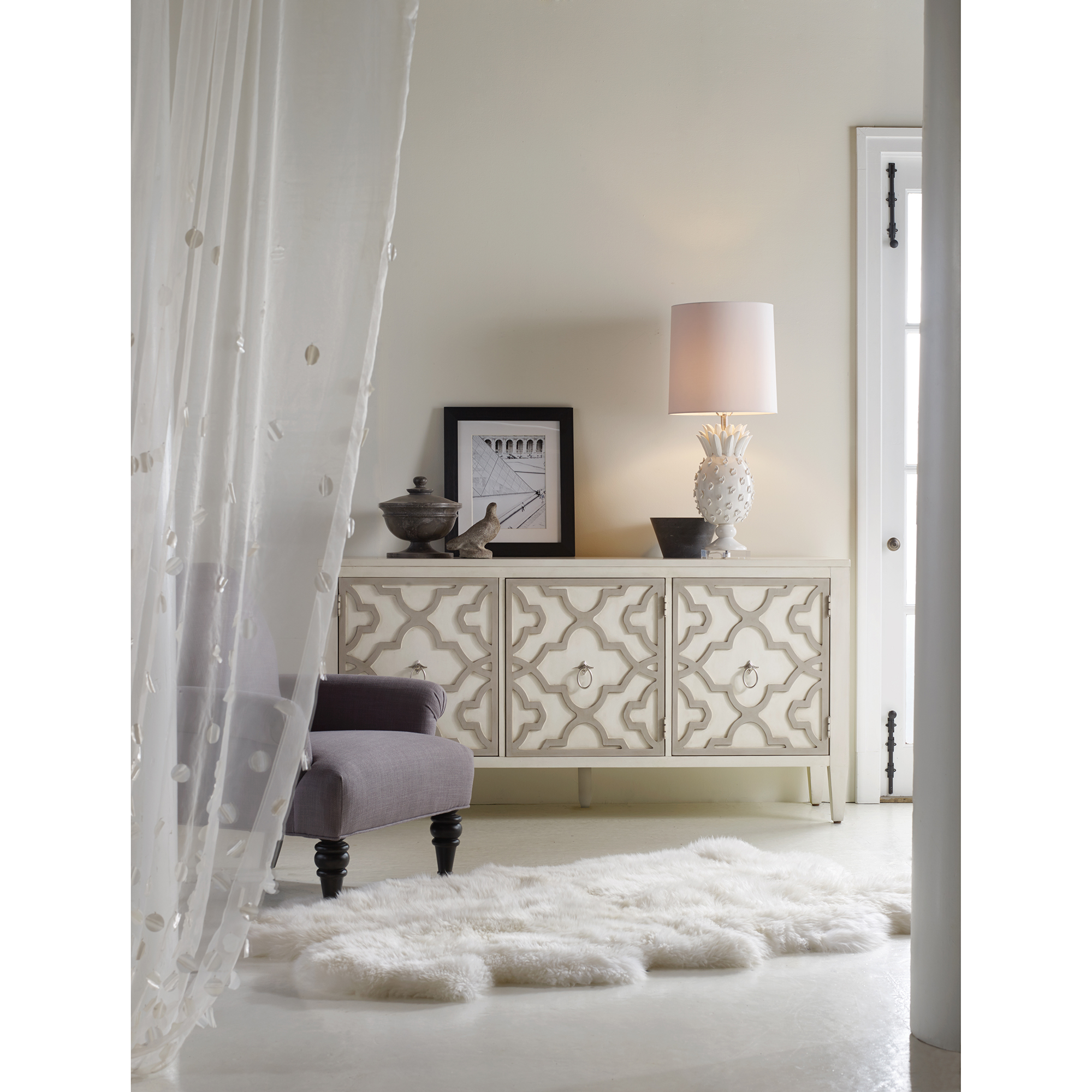 Буфет "Миранда", выполненный в нежных кремовых тонах, оборудован тремя дверцами, украшенными изящной резьбой. За каждой дверцей находится регулируемая полка. Задняя панель буфета оснащена вентиляционными отверстиями.