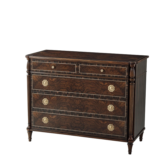 Комод выполнен из красного дерева, декорирован бронзой, шпоном из капа грецкого ореха и черного дерева Амара.