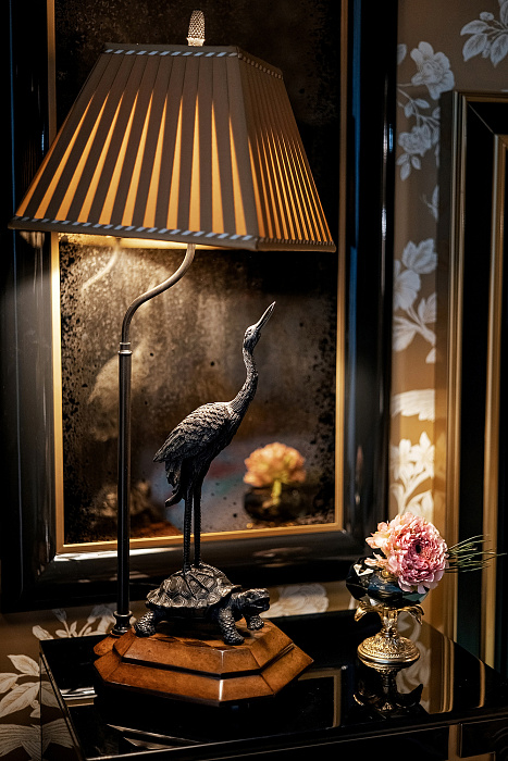 Изысканный дуэт настольных ламп станет ярким акцентом в каждом интерьере. Обе композиции отлиты вручную из бронзы. Базируется основание на подставке из розового дерева. Абажур ручной работы сшит из шелка. Венчают композиции бронзовые флероны.