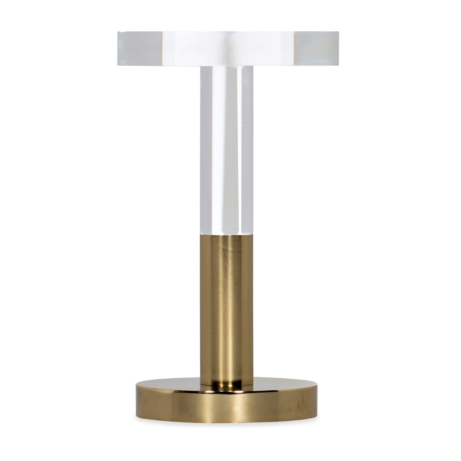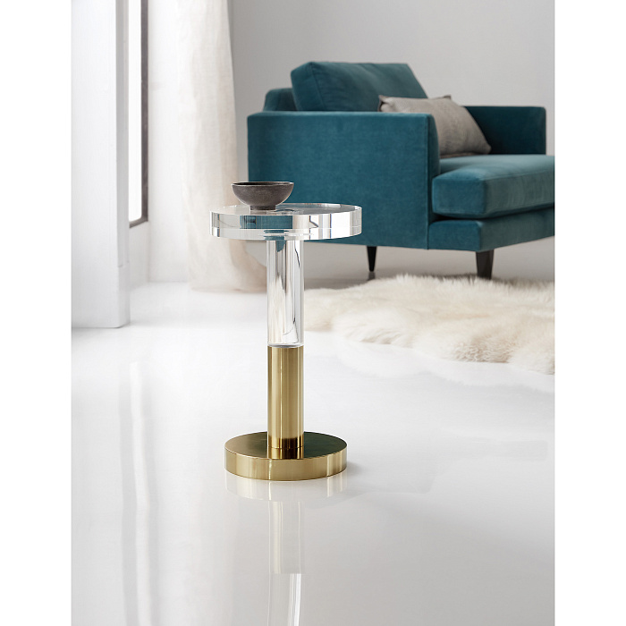 Столик имеет компактную, круглую форму. Золотое металлическое основание выгодно контрастирует с прозрачной верхней частью из акрила.