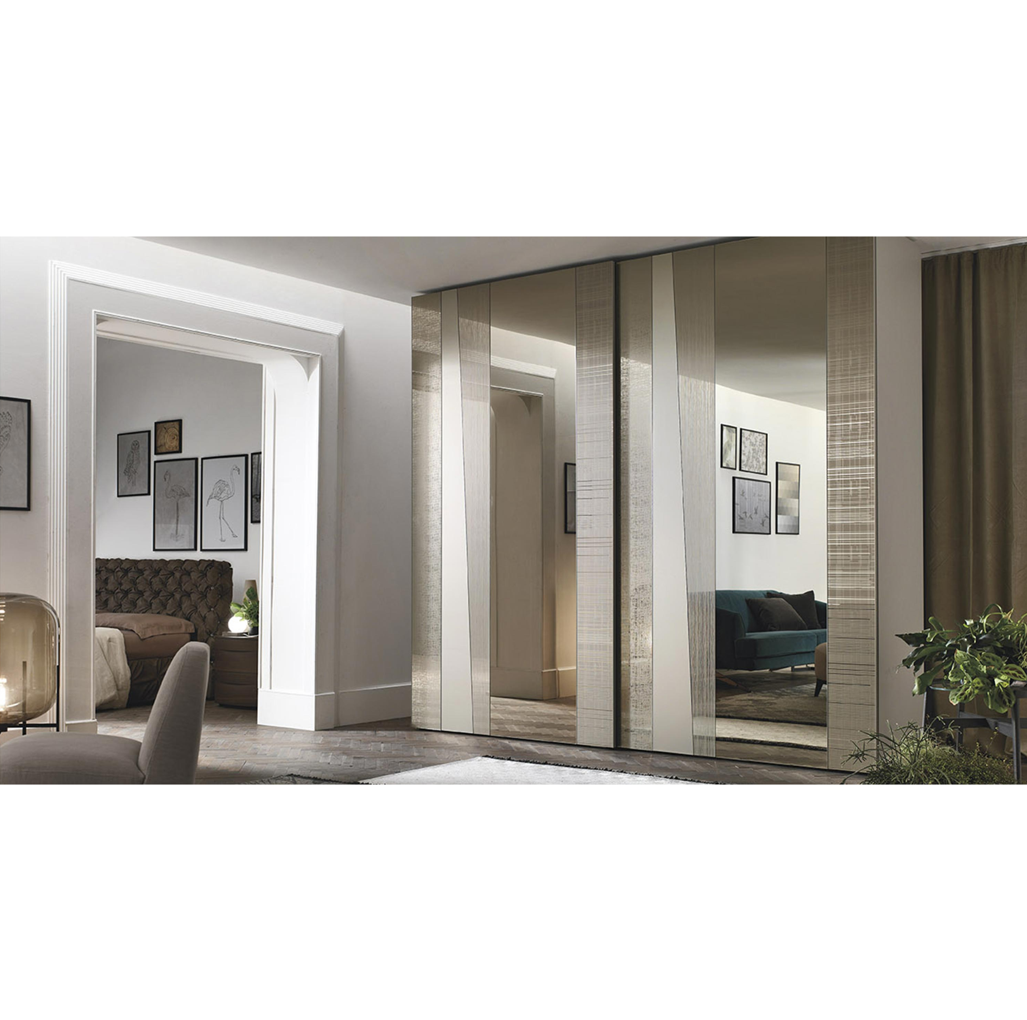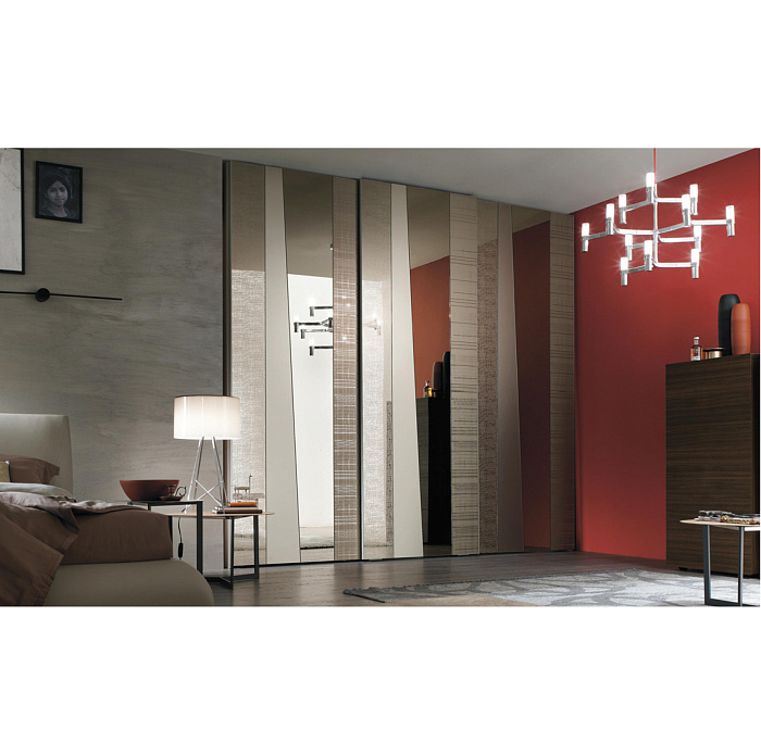 Шкаф Madras с уникальной графической текстурой сразу обращает на себя внимание. Стекла и зеркала отражают свет и расширяют окружающую среду, изменяя атмосферу дома. Шкаф может быть выполнен с 2-мя или 3-мя дверцами. Дверное полотно выполнено из нескольких частей: зеркало с эффектом холста, сатинированное зеркало, зеркало с эффектом древесины, зеркало в цвете bronzato 382 (бронза) и зеркало декорированное полосами.