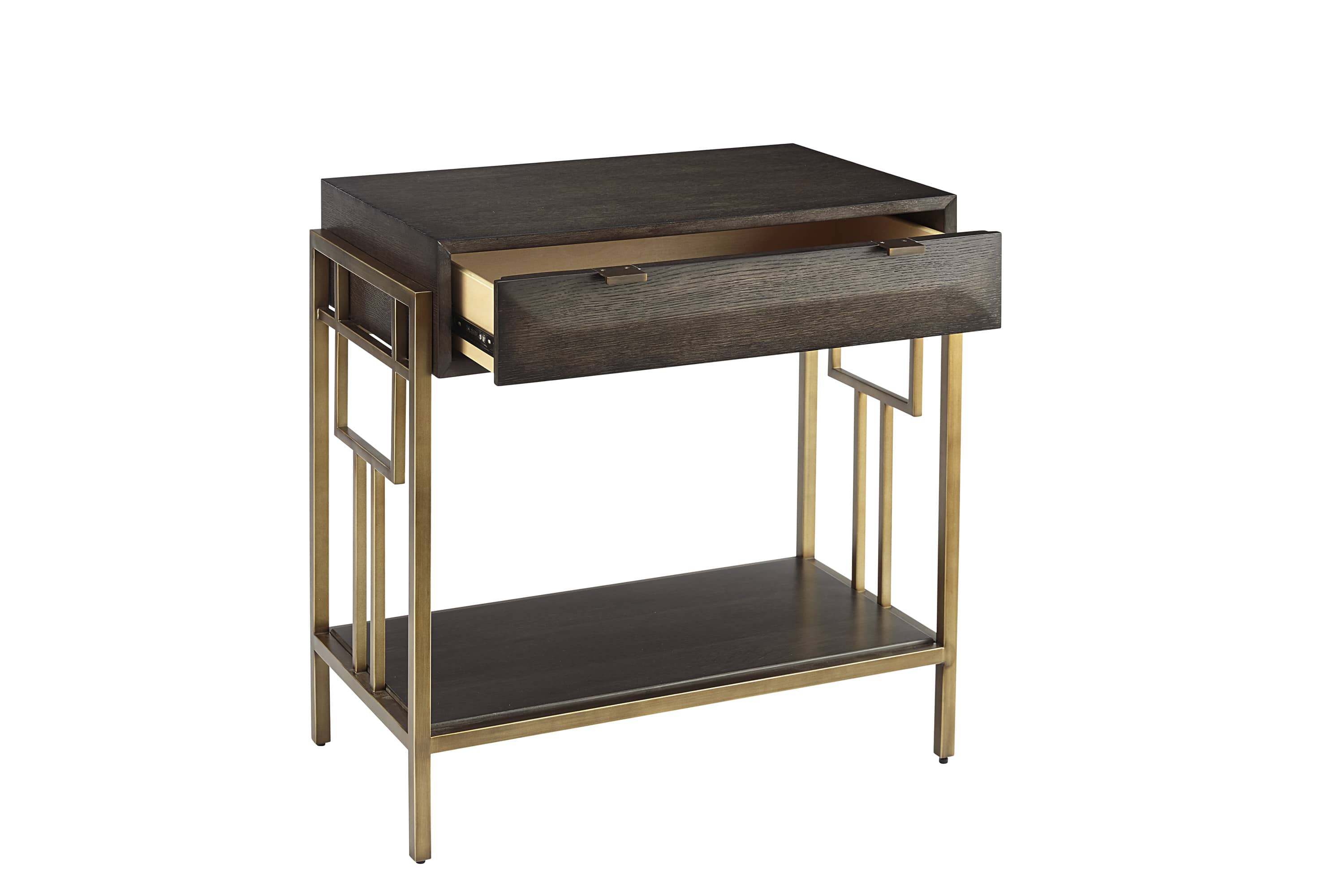 Ламповый столик "Вудрайт" выполнен из массива твердых пород дерева, декорирован шпоном дуба. Основанием служит металлический литой каркас благородного бронзового оттенка.