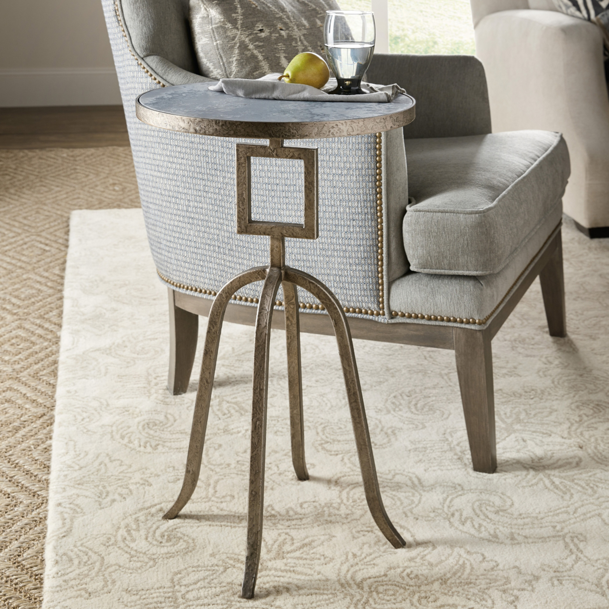 Металлическая база мягкого сияющего оттенка шампань отлично сочетается со столешницей, выполненной из натурального камня, защищенного особой пленкой с декоративным рисунком.