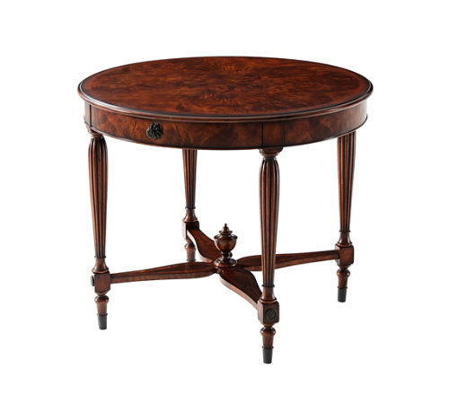 Круглый столик для чая декорирован шпоном мовингу и пламенный махагон. Столешница оснащена двумя выдвижными ящичками. Точеные, сужающиеся книзу каннелированные ножки соединены "Х"- образными подрамником, который венчает резная амфора в стиле Луи Филипп.