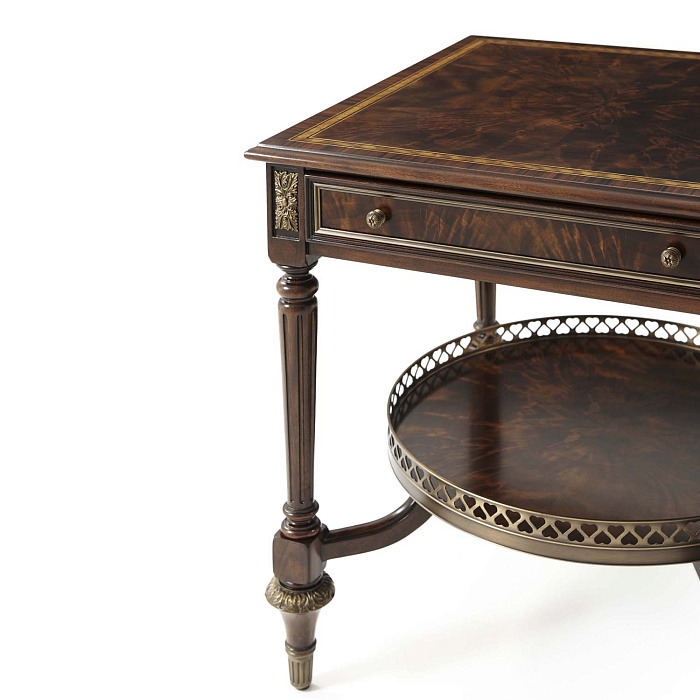Столик в стиле Луи XVI выполнен из массива красного дерева. Столешница и выдвижной ящичек украшены шпоном атласного дерева, а также бронзовыми цветочными накладками, ручками и каймой по периметру. Резные ножки характерные для этого стиля объединены круглым подрамником-полочкой, окаймленным бронзовой решеточкой с рисунком в виде сердечек.