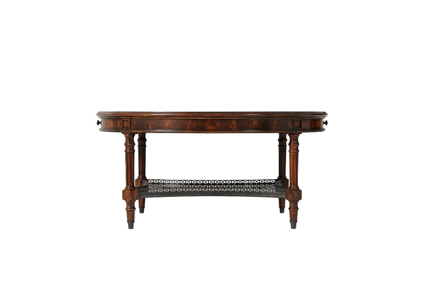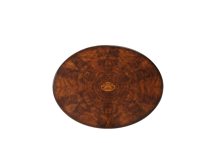 Столик серии Essential в стиле Луи XVI выполнен из шпона "пламенеющего" махагона и шпона вишневого дерева. Круглая столешница имеет геометрический орнамент. Фризовые боковые ящички декорированы круглыми ручками из бронзы. Столик стоит на невысоких резных ножках из массива, защищенных на завершениях бронзовыми накладками. Полочка-подрамник оснащена ажурной бронзовой галереей.