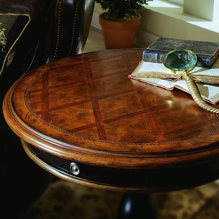 Столик выполнен из массива твердых пород дерева со шпоном из вишни и кедра.