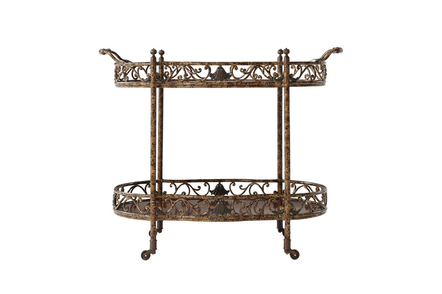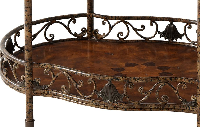 Сервировочный двухъярусный столик на колесиках в европейском стиле 20 века выполнен из специально обработанного металла в сочетании с бронзой. Каждый ярус имеет овальную форму. Основанием верхнего является зеркало, обрамленное бронзовой решеточкой, две ручки которого создают иллюзию подноса. Нижний ярус выполнен из шпона красного дерева и также обрамлен бронзовой решеточкой.