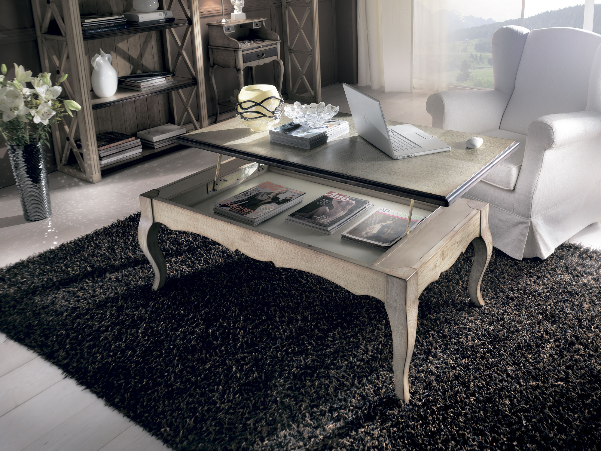 Прямоугольный журнальный столик из коллекции Genova создан из массива. Столешница, выполненная в темном цвете, оснащена подъемным механизмом.