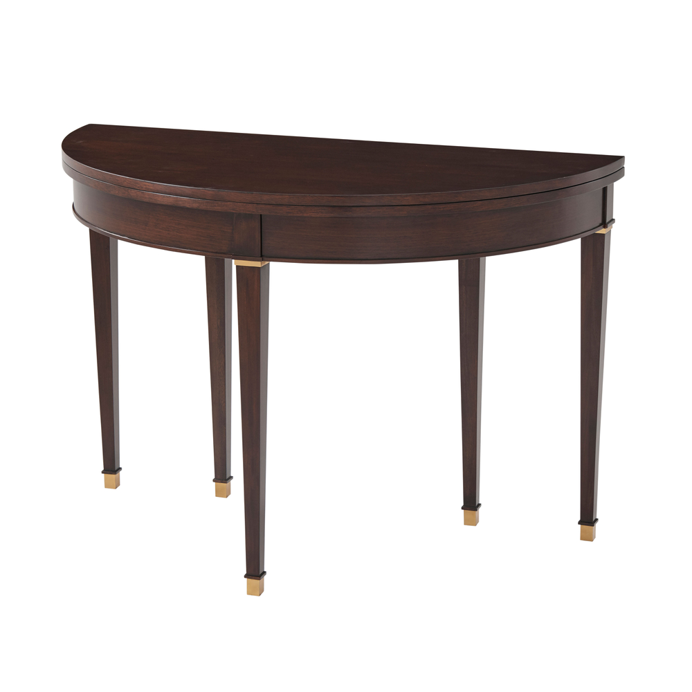 Оптимальное решение для небольшой гостиной. Консольный стол раскладывается и при помощи 2 дополнительных ножек, которые не нужно отсоединять и хранить отдельно, превращается в компактный обеденный стол на 2-4 персоны. Стол выполнен из массива твердых пород дерева, декорирован шпоном Хайя - африканского красного дерева.