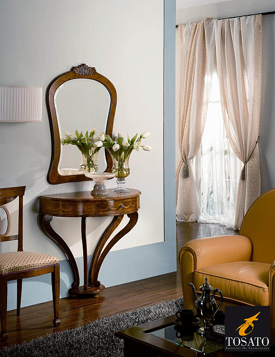 Пристенная консоль с интарсией, оснащенная внутренними потайными ящичками, выполнена мастерами фабрики Tosato, одной из самых известных мебельных фабрик Италии.