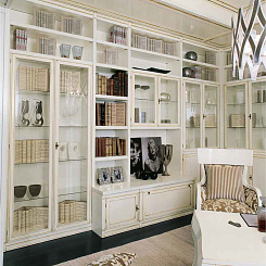 - стеллажи и стенки – идеально для больших гостиных, когда есть достаточно места для установки, они служат не просто ТВ-композициями, а и для организации домашней библиотеки, хранения и выставки посуды и интерьерного декора (выбирайте из роскошных предложений американской компании Globe Wernicke или итальянских фабрик из Вероны Betamobili и SCANDOLA).