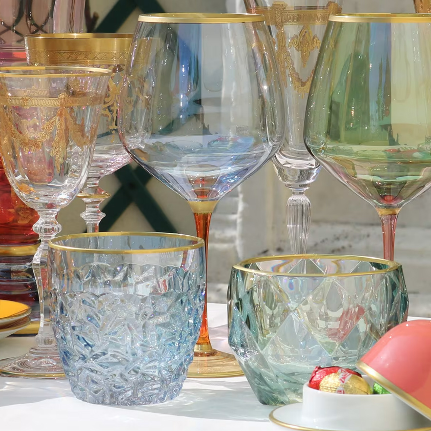 В коллекции представлены бокалы различной формы и огранки, которые были придуманы для создания эффектных текстур. Интересная огранка каждого бокала подчеркнута использованием сочных цветов. Завершающим штрихом является золотой акцент, нанесенный вручную на ободок каждого изделия, который дополняет оттенки набора. Как отдельно, так и в сочетании с другими изделиями коллекции этот набор будет эффектно смотреться в любом интерьере.